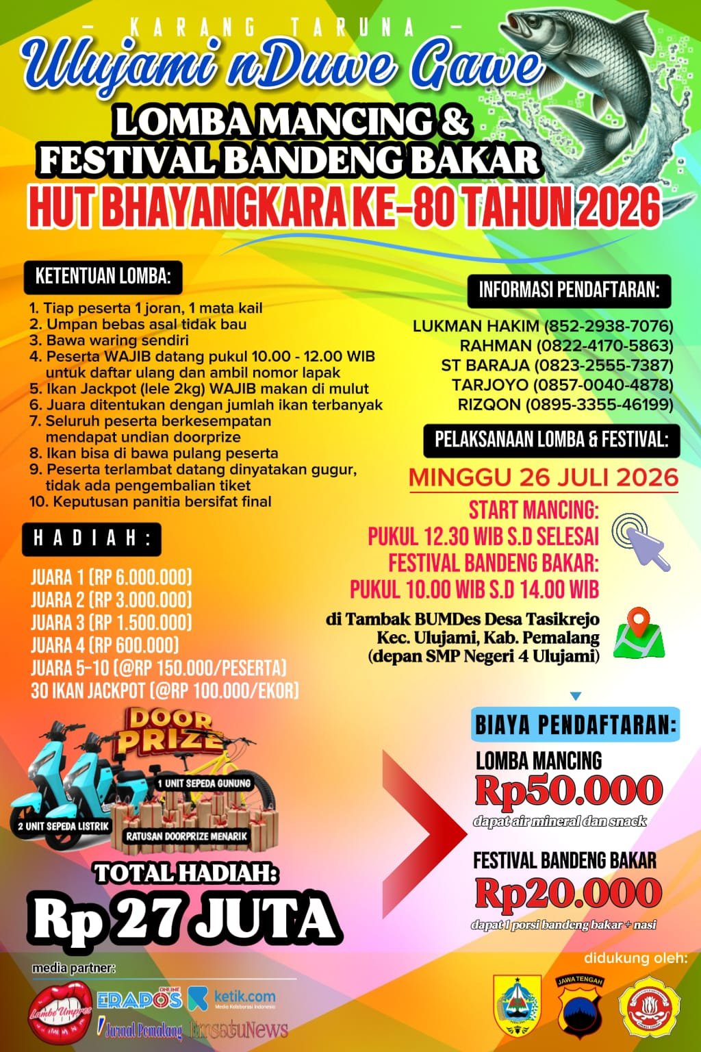 PEMALANG | rakyatcerdas.my.id – Dalam rangka memeriahkan Hari Ulang Tahun (HUT) Bhayangkara ke-80 tahun 2026, Karang Taruna Ulujami menggelar kegiatan bertajuk “Ulujami nduwe Gawe” berupa lomba mancing dan festival bandeng bakar yang dipastikan berlangsung meriah dan penuh semangat kebersamaan.